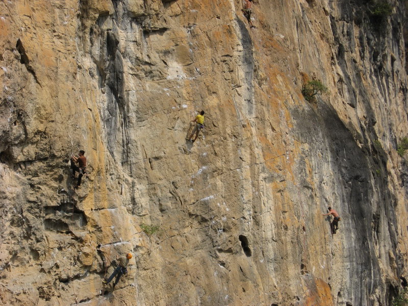 雷辟山的二楼,海豚和深圳的岩友爬12a的磨溪土著线。三楼,有天空,琼姐等人在岩壁上爬,最右边的岩壁挂着袁天,他在分段work那条13c的线路。