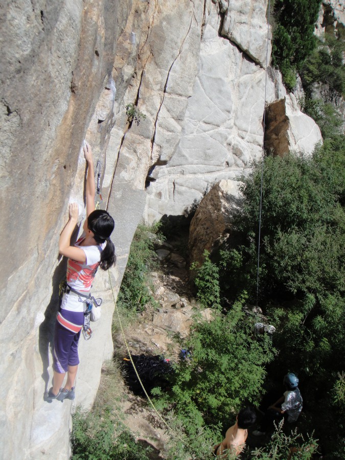 第三条线,5.10a, 洋洋姐保护,先锋。这条线起步是条裂缝,我爬裂缝最狗屎,只挂了一把快挂,手臂就硬了,上不了高脚爬不上去就下来了。洋洋姐红了这条线,酷儿没爬,雨砾安了。最后,海豚帮我收快挂也爬了这条线。磨溪村长说,看海豚爬这条线的动作就知道海豚进步很大。是呀,接下去全是海豚收获的日子。