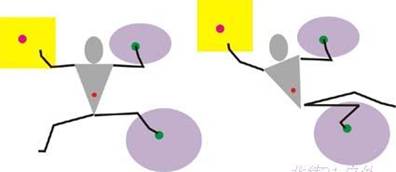 现在,如果你直接松开右手,肯定要掉,因为你的重心落在了左手左脚上,是不平衡的姿势。用到上面所讲的原则,你需要改变姿势,重新获得持平衡,然后再松开