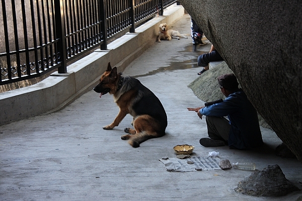 一条金毛和德牧路过 金毛明显偏瘦 不知道是不是水土不服