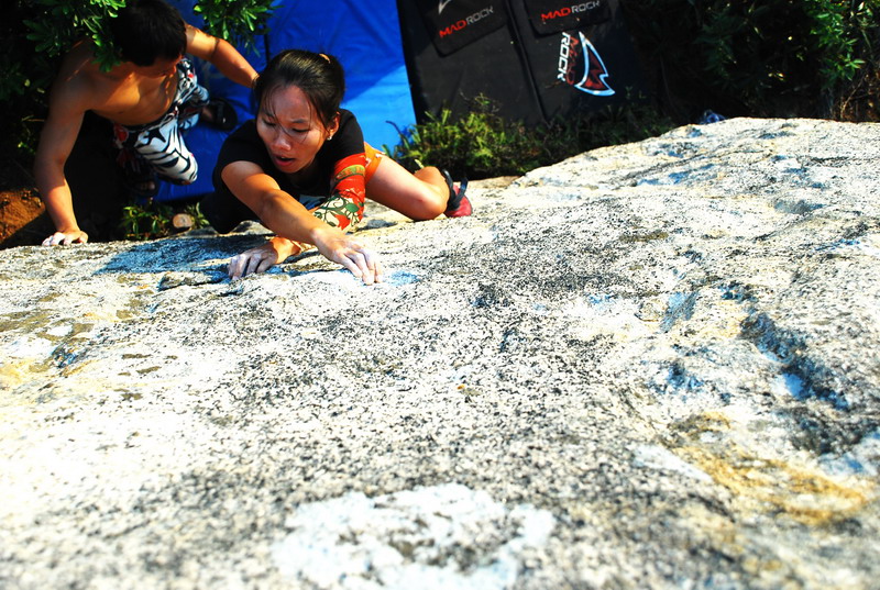 够是够着了,也上了左高脚,也尽力往左侧压脚了,可怎么也拍不上石头顶上的那个好手点,足足有差5cm-6cm的高度呀。动